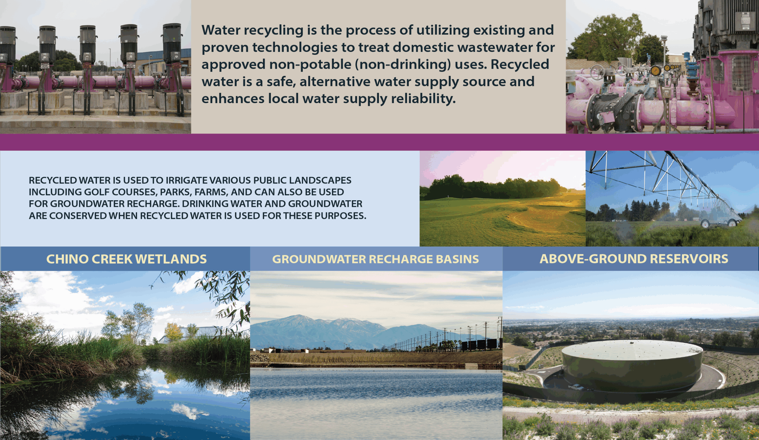 From the effluent of the contact basins, disinfected tertiary recycled water is pumped into the distribution pipeline network to deliver recycled water to the facility for internal use, industrial users, irrigation, and groundwater recharge. Water not pumped into the recycled water distribution pipeline network is dechlorinated with sodium bisulfite prior to being discharged to an outfall point. The facility outfalls may discharge to creeks, rivers, or lakes.